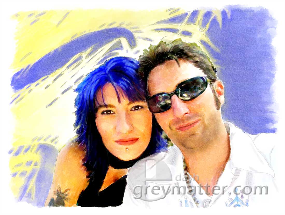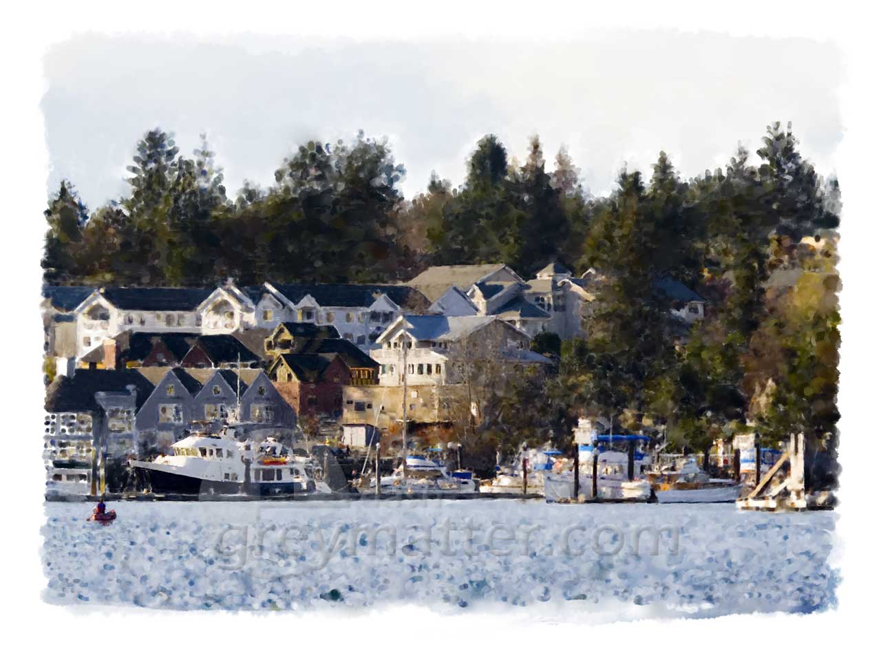 Digital watercolors are hand-painted using Photoshop™. Beginning with a photo, I first draw the major contours using a Digitizing Tablet and Sketchbook Pro™. I import this 'pencil sketch' into Photoshop. Then sampling colors from the photo, each stroke is hand-painted on the digital tablet in Photoshop. As a final step an overlay is added for the watercolor texture.